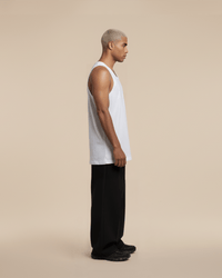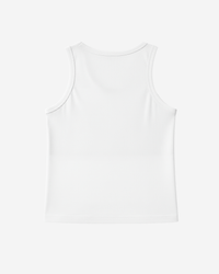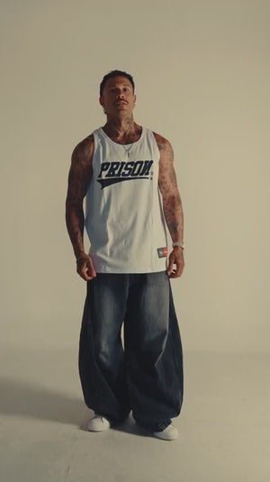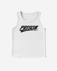 White PRISON® slim-fit streetwear tank top with custom logo, reinforced ribbed collar and armholes, straight hem with original PRISON hem label, streetwear fit and sturdy seams. Lightweight and breathable for training, going out and creating a statement look.